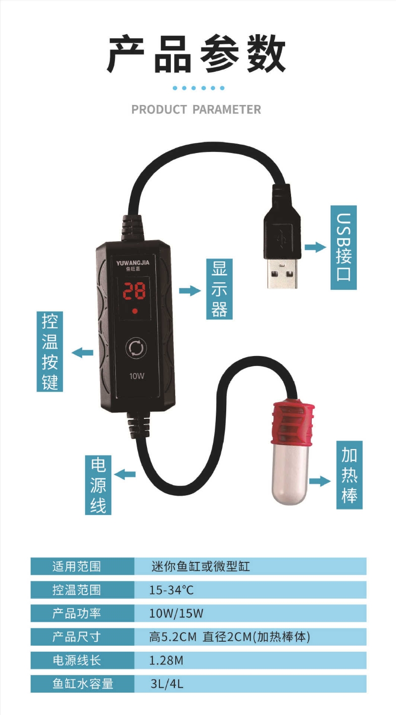 USB5V魚缸加熱棒外置調温-15W