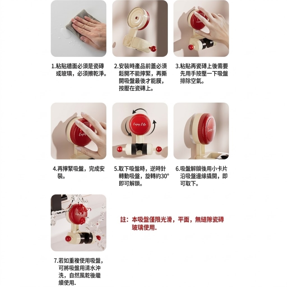 請勿使用於粗糙牆面、粉刷牆、壁紙或有裂縫的磁磚上,以免影響吸附效果。