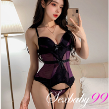 性感蕾絲網紗情趣馬甲套裝-紫色