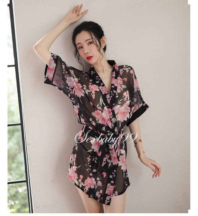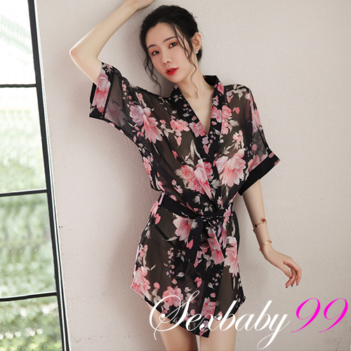 微甜氛圍-性感透視雪紡印花睡裙外罩衫-黑色