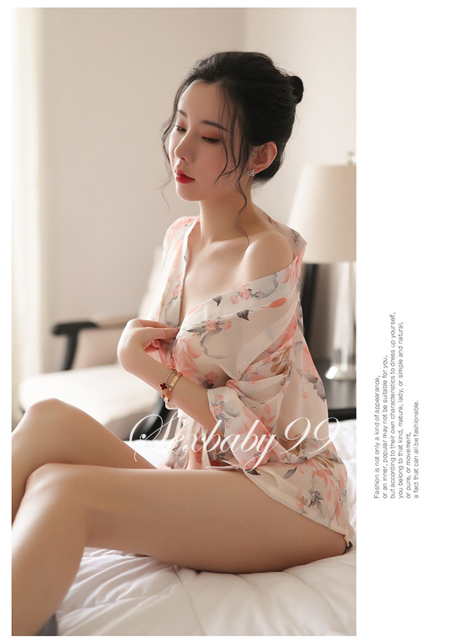 微甜氛圍-性感透視雪紡印花睡裙外罩衫-米色