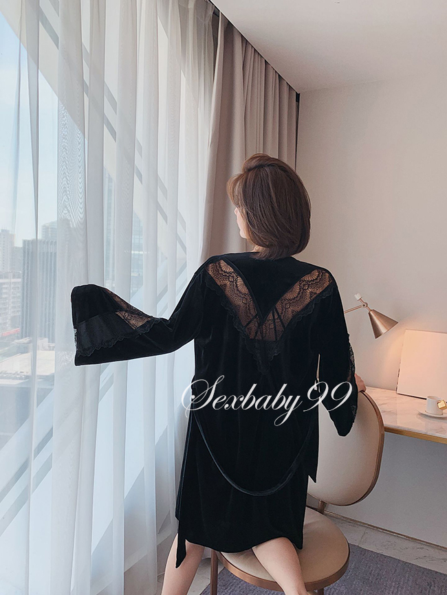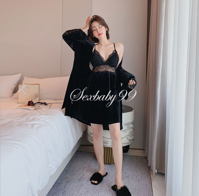 夢醒時分-金絲絨可拆胸墊吊帶睡裙兩件組-黑色-L
