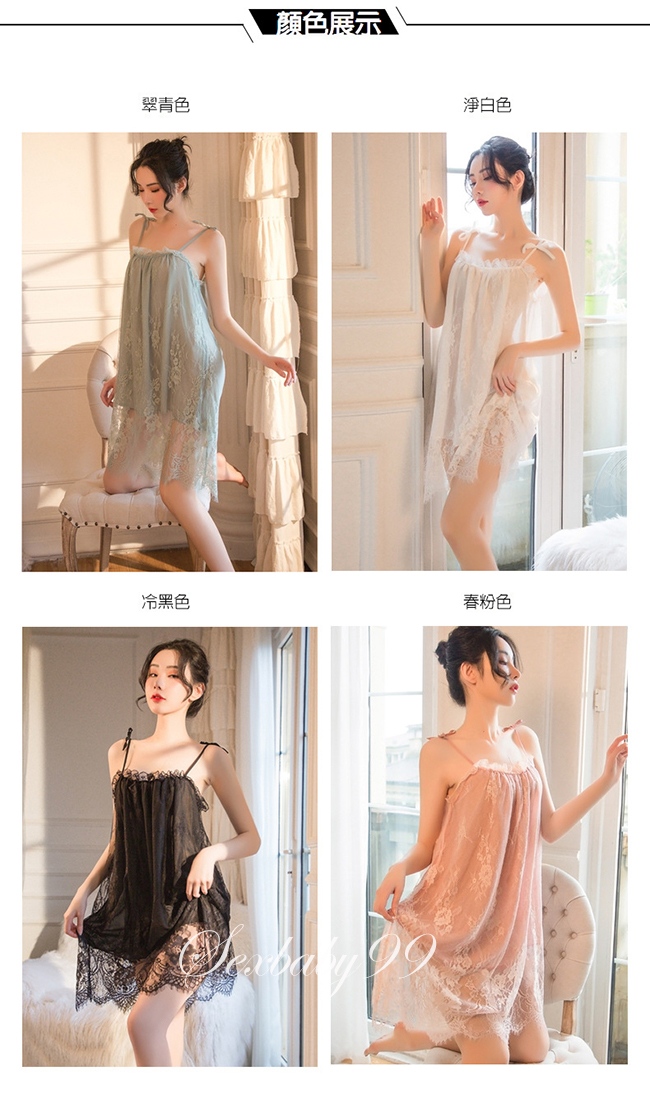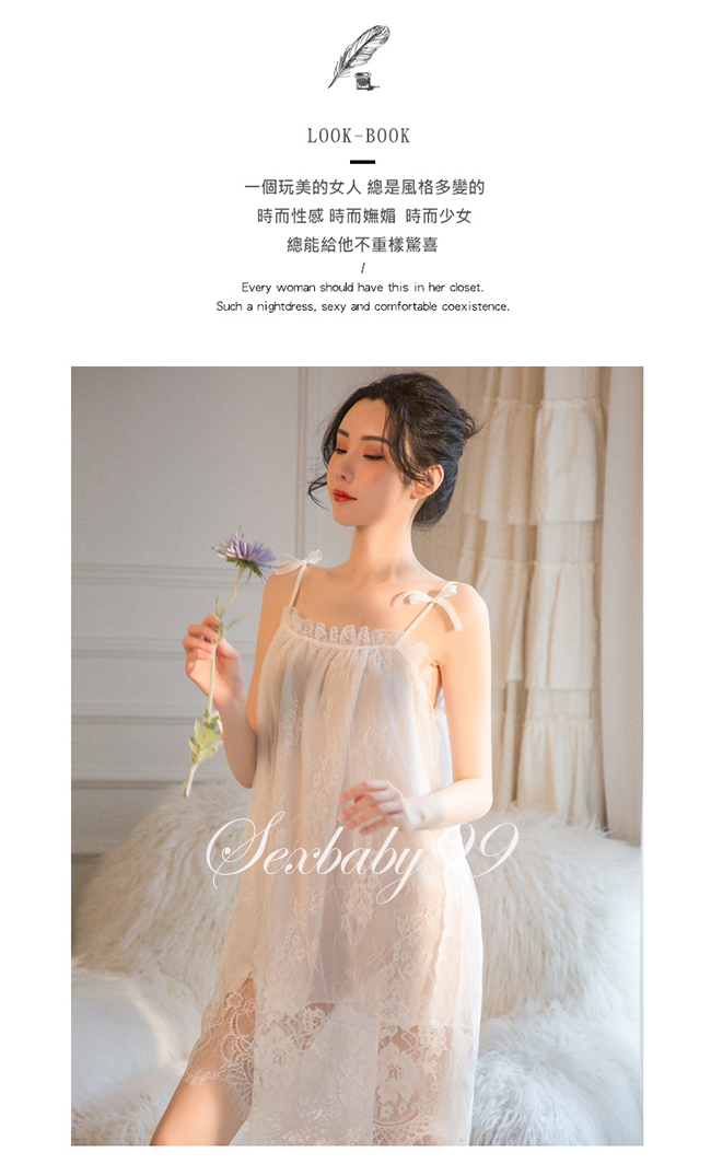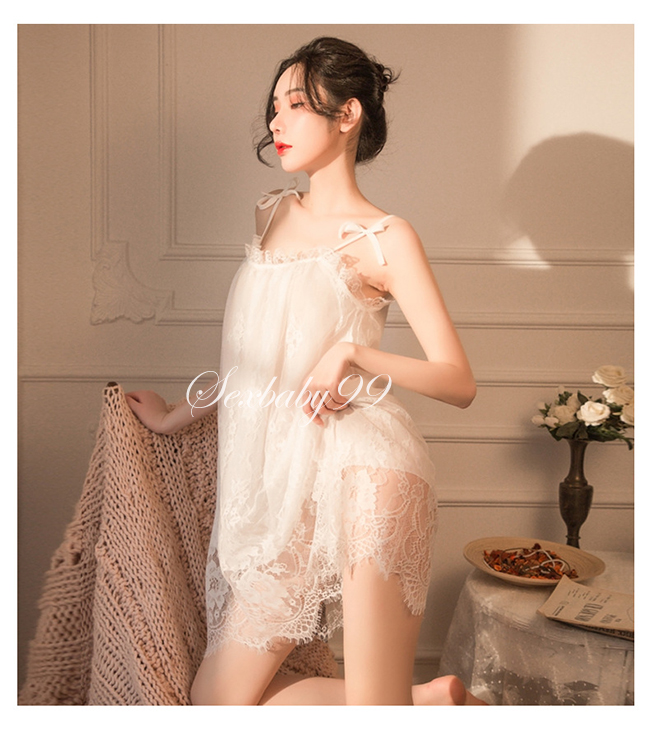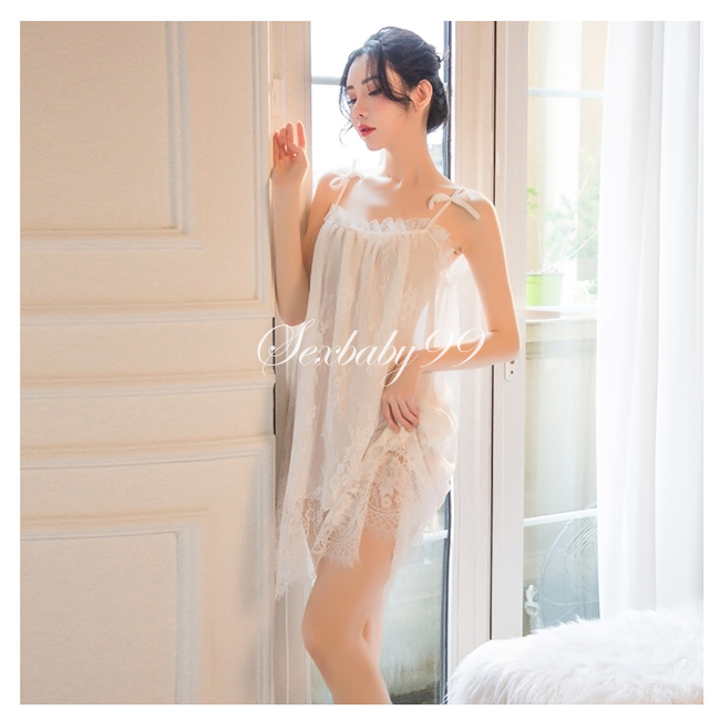 巧笑倩兮-性感誘惑蕾絲吊帶睡裙-淨白色
