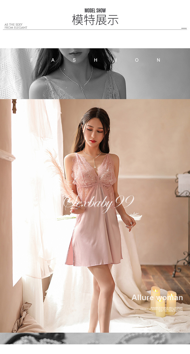 月色撩人-性感露背深V仿真絲吊帶睡裙-粉色-M