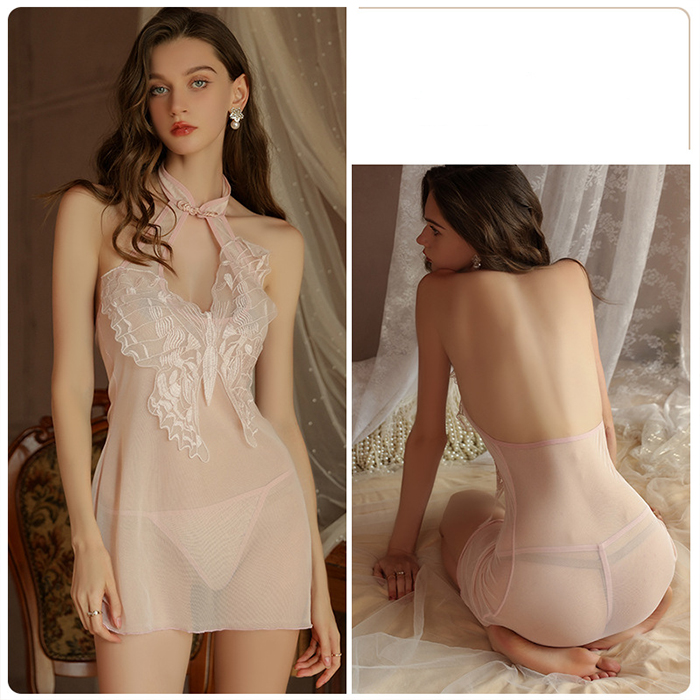 朱脣粉面 蝴蝶透紗露背性感旗袍角色扮演服-粉色