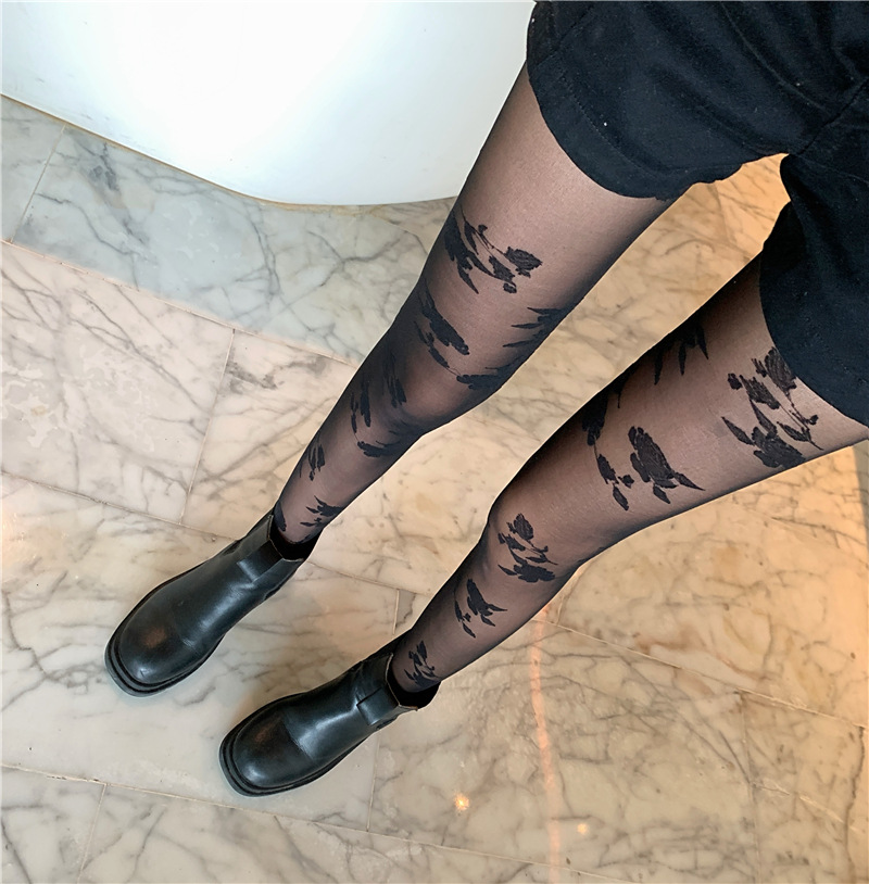 刺繡玫瑰花復古薄款絲襪-黑色