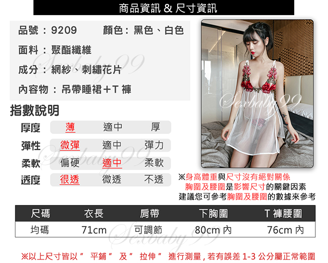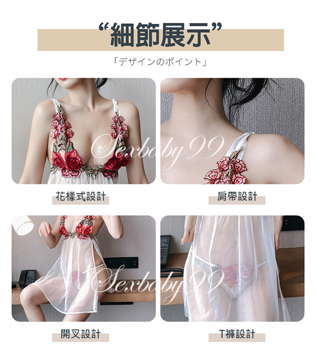 艷麗撩人-性感玫瑰刺繡深V透視吊帶睡裙-白色